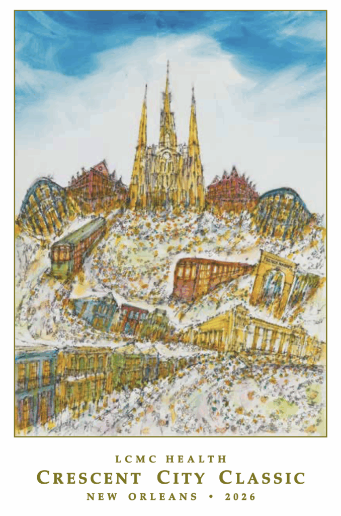 This year’s poster is painted by renowned local artist, Nurhan Gokturk. The 20″ x 30″ print captures the iconic red streetcar on City Park Ave. The finish line at NOMA is reflected in the streetcar’s windows.